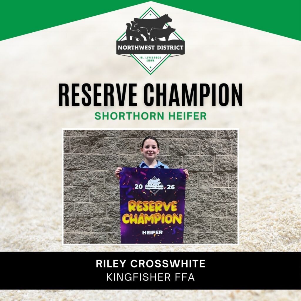 CROSSWHITE EARNS RESERVE CHAMPION AT NWJLS Congratulations to Riley Crosswhite of Kingfisher FFA on earning Reserve Champion Shorthorn Heifer on Day 5 of the Northwest District Junior Livestock Show. Great work representing Kingfisher at the 92nd annual show. Continue Reading Previous: BREWING CONNECTIONS AT CTTCNext: BURNS EARNS RESERVE SUPREME Featured News DOBRINSKI RECOGNIZES LOMEGA & OKARCHE CHAMPIONSHIP TEAMS 1 DOBRINSKI RECOGNIZES LOMEGA & OKARCHE CHAMPIONSHIP TEAMS Handmade Talent on Display at Library Showcase 2 Handmade Talent on Display at Library Showcase Kingfisher County Honors Those Who Answer the Call 3 Kingfisher County Honors Those Who Answer the Call HELP THE BROOMFIELD FAMILY 4 HELP THE BROOMFIELD FAMILY Bree Yost Crowned 2027 Miss Kingfisher County 5 Bree Yost Crowned 2027 Miss Kingfisher County Big 4 Chili Cook-Off Heats Things Up 6 Big 4 Chili Cook-Off Heats Things Up Related Stories MEET THE NEW KPS SCHOOL BOARD PASSING OF THE TORCH 2X NATIONAL CHOIR CHAMPIONS KHS STUDENTS OF FEBRUARY DAVIS SANDERS PAGES FOR REP. DOBRINSKI HAMMING IT UP