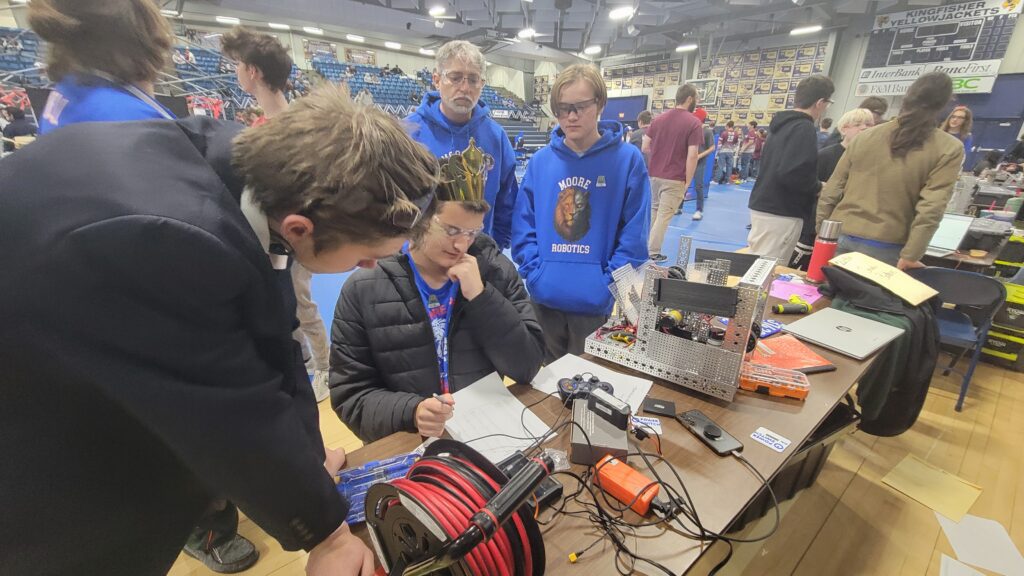 Throughout the day, the gym buzzed with activity as robots zipped across the field, teams made last-minute adjustments, and students collaborated to solve problems on the fly.
